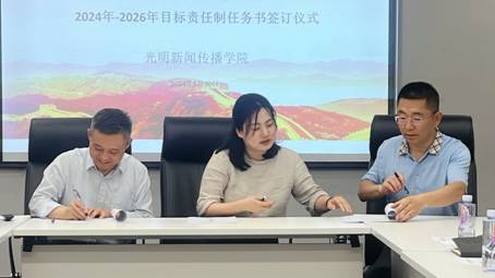 (公司党委书记尚武、常务副经理姚泽金与网络与新媒体研究所所长郑满宁签署任务书)